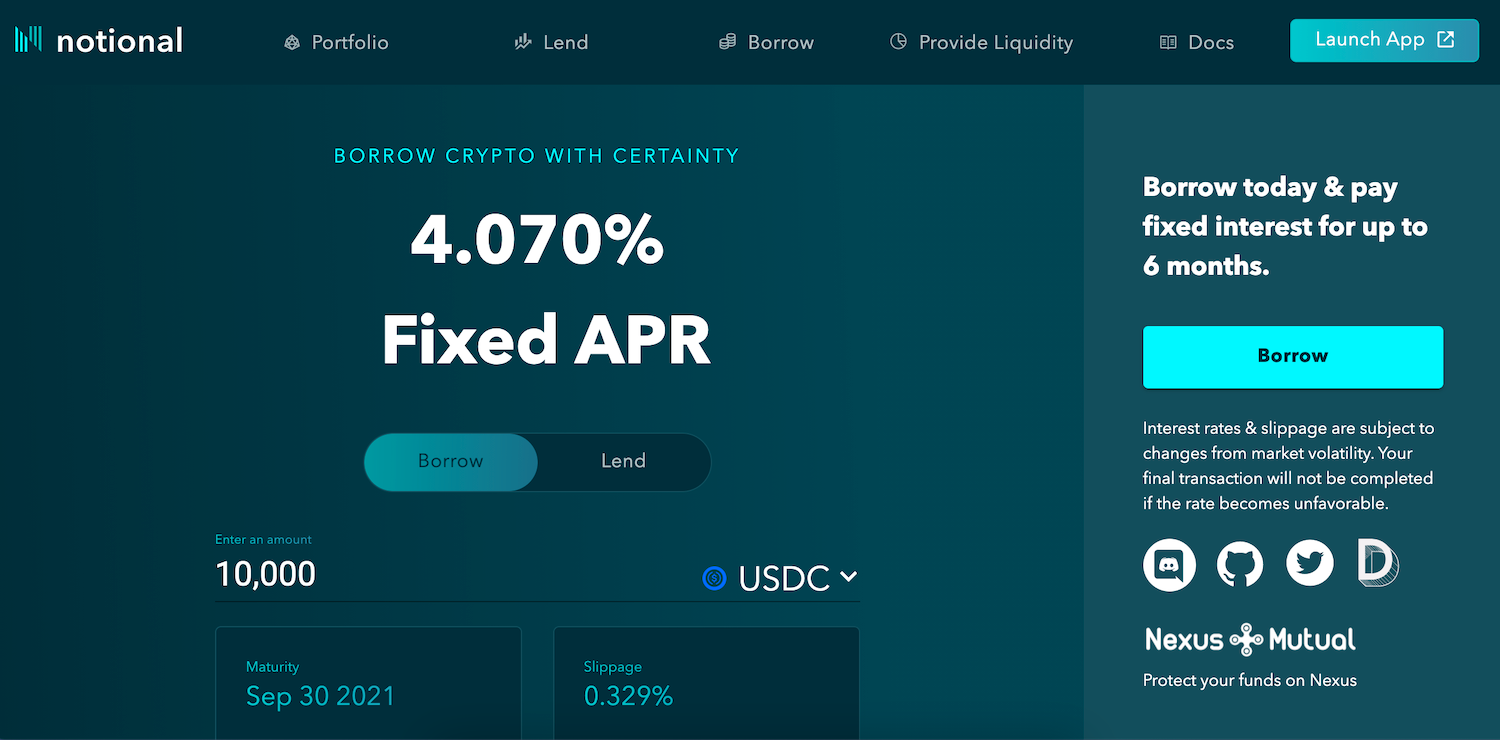 Notional allows cryptocurrency holders to lend and borrow their assets at a fixed term for a fixed interest rate. Notional's system is powered by their fCash tokens.
