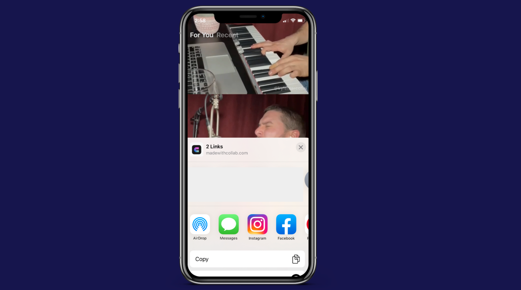 In order to create a Collab video, you can either upload three 15-second videos and sync them together, or you can build upon another musician’s Collab by syncing yourself to their video.