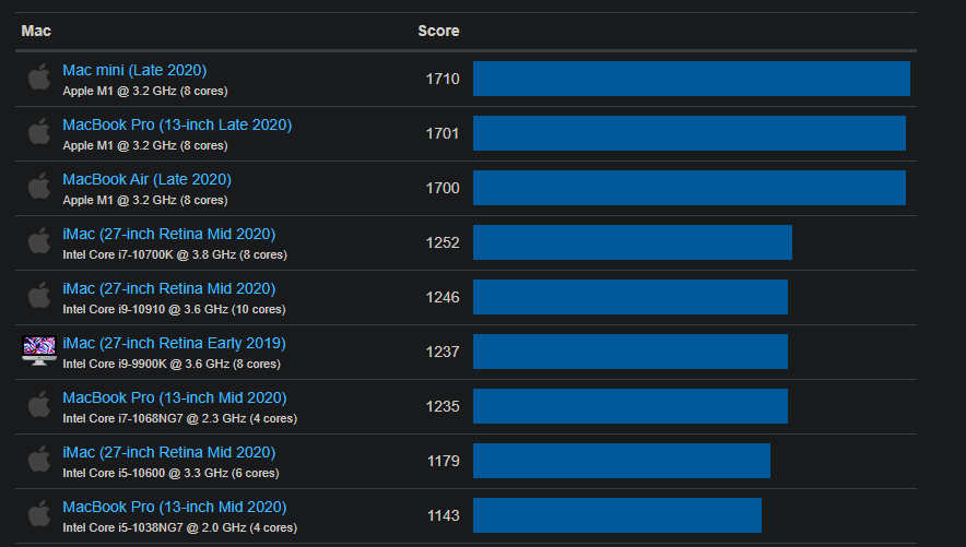 The performance of the M1 chip has been clearly demonstrated in both benchmarking tests and real-world tests. In benchmarking scores, Macs with the M1 chip achieved higher numbers than the most powerful Intel-based Macs that Apple offered.